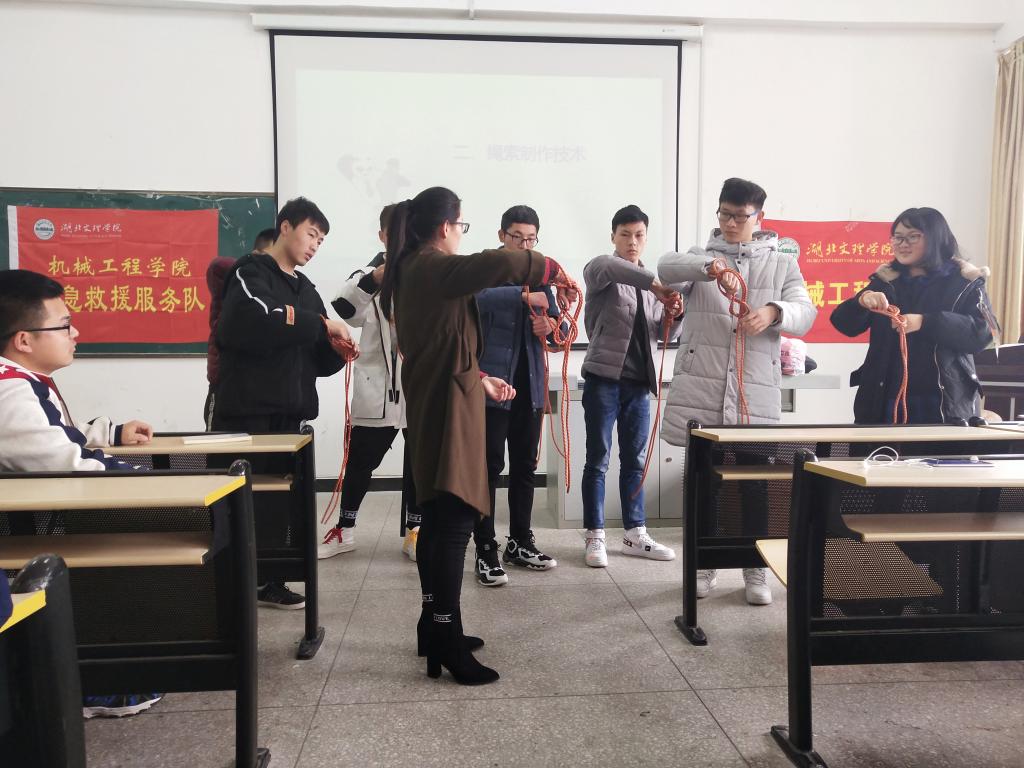 第一讲,绳索技术。小小的绳索在此刻化身天使,对抗伤病,救己救人。方梦萍根据情景教授了不同的绳索制作技术,与大家进行亲切的交流。实践环节上,同学们积极行动,争取将所学知识牢记于心。