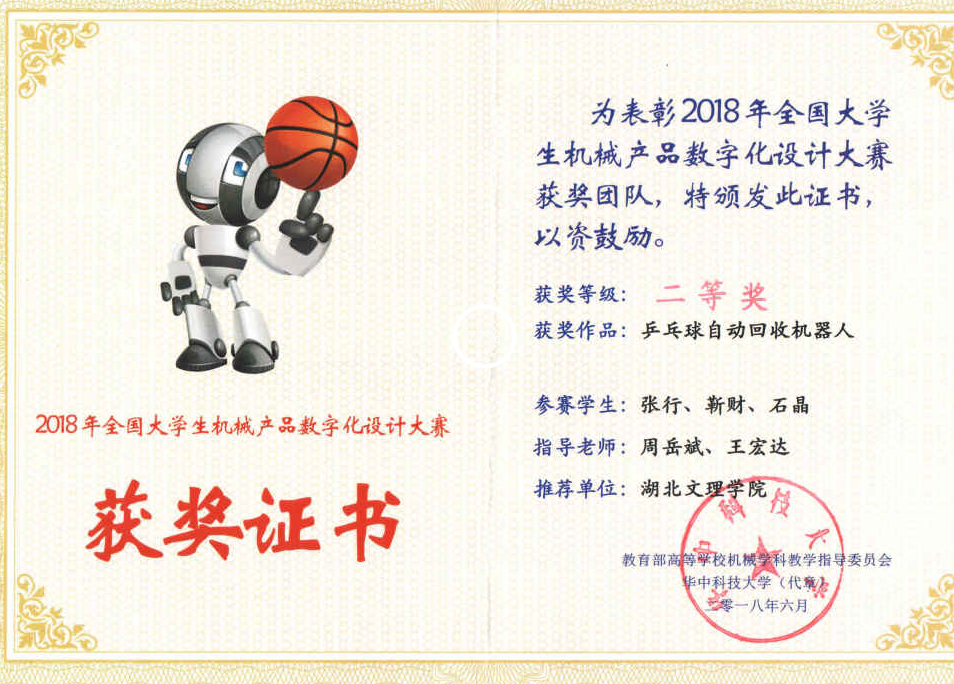 (威廉希尔官网 教工通讯员 周岳斌) 2018年6月2日,全国大员工机械产品数字化设计大赛全国总决赛在武昌首义威廉希尔官网举行。此前的初赛,共有包括哈尔滨工业大学、北京理工大学、同济大学、浙江大学、西安交通大学、武汉理工大学等46所高校入围全国总决赛。我校威廉希尔官网员工提交的作品“乒乓球自动回收机器人”(参赛员工:张行、靳财、石晶,指导老师:周岳斌、王宏达),在决赛阶段经过预赛答辩和现场作品设计环节的激励角逐,最终荣获全国总决赛二等奖。