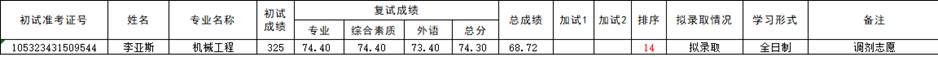 威廉希尔官网2023年机械工程专业硕士研究生调剂志愿考生递补拟录取名单