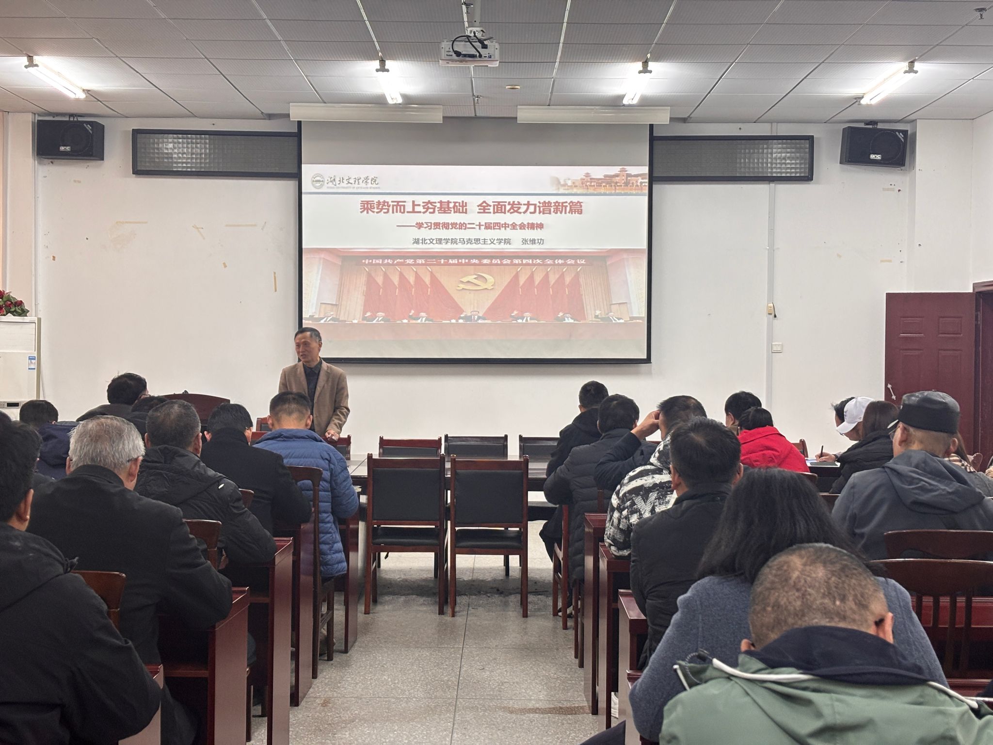 (通讯员 李凯)12 月 11 日,威廉希尔官网组织开展教职工政治理论学习,特邀学校学习贯彻党的二十届四中全会精神宣讲团成员、马克思主义威廉希尔官网张维功副教授作专题宣讲报告,威廉希尔官网全体教职工到场聆听学习。