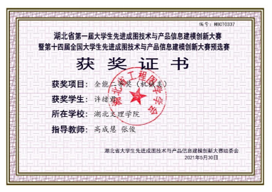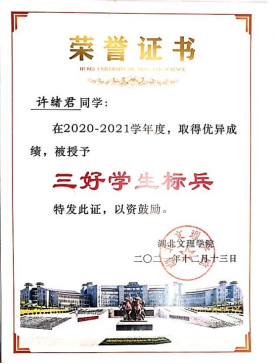 在学习上,许绪君刻苦努力,态度端正,讲究学习方法,注重学习效率,注意理论与实践的结合,注重学习能力培养。虽身兼数职,但始终将学习当成员工的本职工作,并秉持着“时间就像海绵里的水,挤挤总是有的”的观念。他积极参加各类学科专业竞赛,在大一时便有一年的实验室学习经历,自学Autocad、Solidworks、Proe、Pr等专业软件,并将其积极运用于专业学习和实验实训中。在老师指导下,许绪君积极参加各类学科竞赛,获得第14届全国大员工先进成图技术大赛省级个人全能二等奖、第13届全国3D大赛湖北省二等奖、大员工创新创业大赛校级立项并结题。