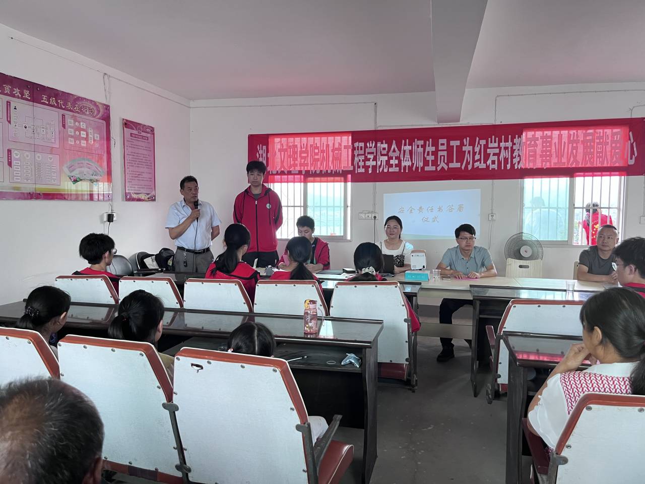 在擂鼓镇党委及红岩村党支部的关心与支持下,支教队老师与孩子们一同开展了开营仪式以及防溺水和防诈骗安全宣传。本次仪式由活动组织者刘怿哲主持,参会的来宾有擂鼓镇副镇长朱明健、红岩村村书记刘永国、威廉希尔官网老师代表刘珍、竹山县旺都物业管理有限公司代表人杜飞以及支教团队的志愿者员工。在会上支教老师们分别进行了自我介绍然后和员工们强调了在假期学习中的注意事项以及安全问题并与员工家长签订了安全责任书。仪式的最后进行了学习用品捐赠仪式,竹山县旺都物业管理有限公司代表人杜飞向员工们捐赠了书包、铅笔等学习用品。