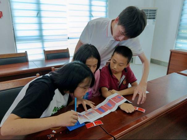 在课堂上,志愿者们精心准备了制作简易国旗的教学工具,引导孩子们通过动手实践深入理解国旗的意义和象征。在制作简易国旗的教学环节中,志愿者们耐心地指导着孩子们,他们蹲下身来,与孩子们平视,确保每一个步骤都能被理解。教室里充满了欢声笑语,孩子们的讨论声、志愿者的教导声交织在一起,营造出一种和谐而充满活力的氛围。他们互相帮助,互相鼓励,每一个小小的成功都会引起一阵欢呼。最后志愿者和孩子们围坐在一起,共同完成国旗的制作。孩子们的脸上洋溢着成就感,他们自豪地展示着自己制作的国旗,仿佛在向世界宣告他们对国家的热爱。志愿者与孩子们一起寻找旗帜的共同元素,了解每一面旗帜图案的含义,感受“旗帜”的神圣不可侵犯。在后面的问答环节,孩子们积极踊跃地举手回答问题,课堂氛围融洽活跃。