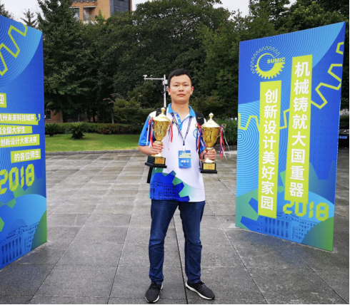 在备战的最后阶段,为了准备好作品的展板以及宣传册,他常常顶着三十多度的高温扛着展板往返于学校西门的印刷店与工科楼之间。在经历了校赛过后,他所在的团队以极大的优势胜出,并且在第八届全国大员工机械创新设计大赛中,他凭借参赛作品“魔方式立体停车库”获得了全国一等奖以及优秀成果转化奖作品得到了中国工程院王天然院士的高度评价,同时被大赛的赞助商“江苏金冠停车产业股份有限公司”现场收购